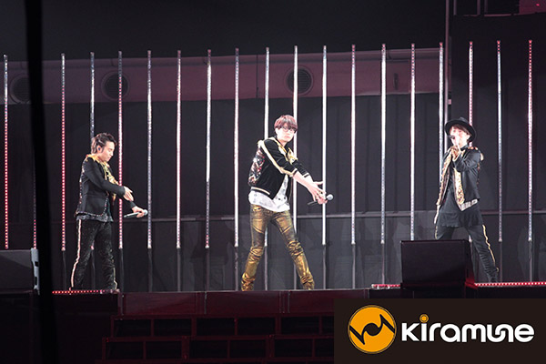 まず開幕を飾ったのはTrignal(江口拓也さん・木村良平さん・代永 翼さん)の3人。幕開けにふさわしいゴージャスな衣装で、「Update A Day」を熱唱。江口さんの「最後まで最高の1日にしていきましょう!」の掛け声で、会場は早くも熱狂に包まれました。そして「Kiss Plus」、「Win-possible!」と続き、3人ならではの息の合ったダンスや、江口さんのラップ・通称「えぐラップ」で、会場は更にヒートアップ!