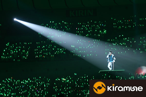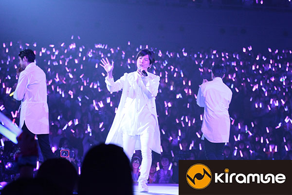 トリを飾ったのは岡本さん。「君の笑顔 僕の笑顔」のクライマックスには、とびっきりのスマイルを見せ、観客達を悩殺♪ 続いては、自身が作詞し、Kiramuneメンバー全員がコーラスを担当した「8piece」。曲が完成するまでのメンバーたちとの暖かなやりとり、そしてアーティスト活動5周年を迎えた岡本さんの心境など、数々の秘話が語られ、岡本さんも観客も感極まった様子でコール&レスポンスを贈り合っていました。感動はまだまだ止まず、「Happy memories」を、「みんな幸せになりますように!」という掛け声とともに熱唱。ラストには、多数の鳥の形をした紙がアリーナ上方から舞い降りてくるサプライズが。さらに中にはメンバーからの直筆メッセージが書かれたものもあり、ファンにとって最高のプレゼントとなりました!