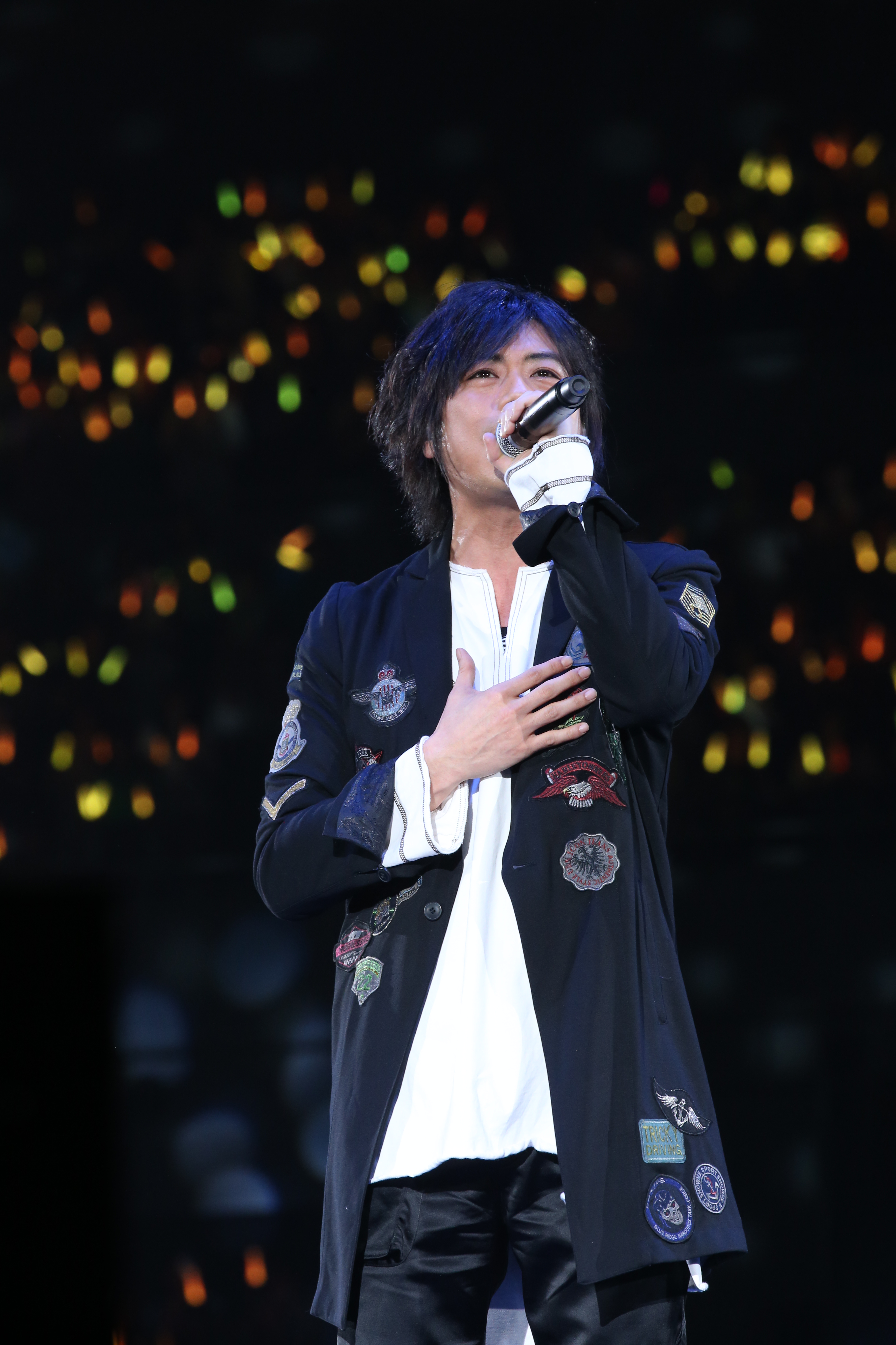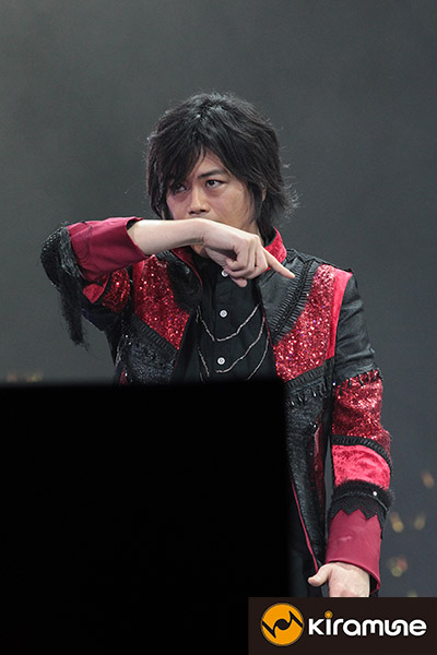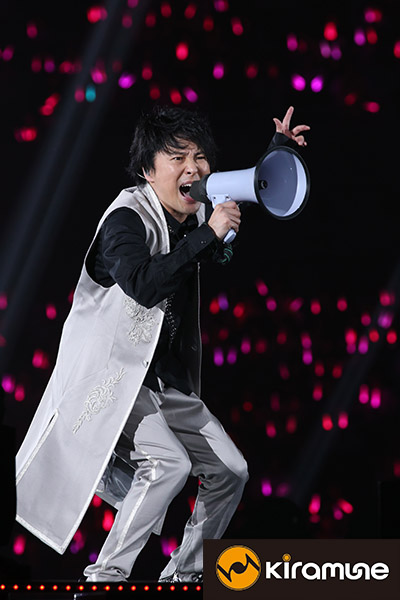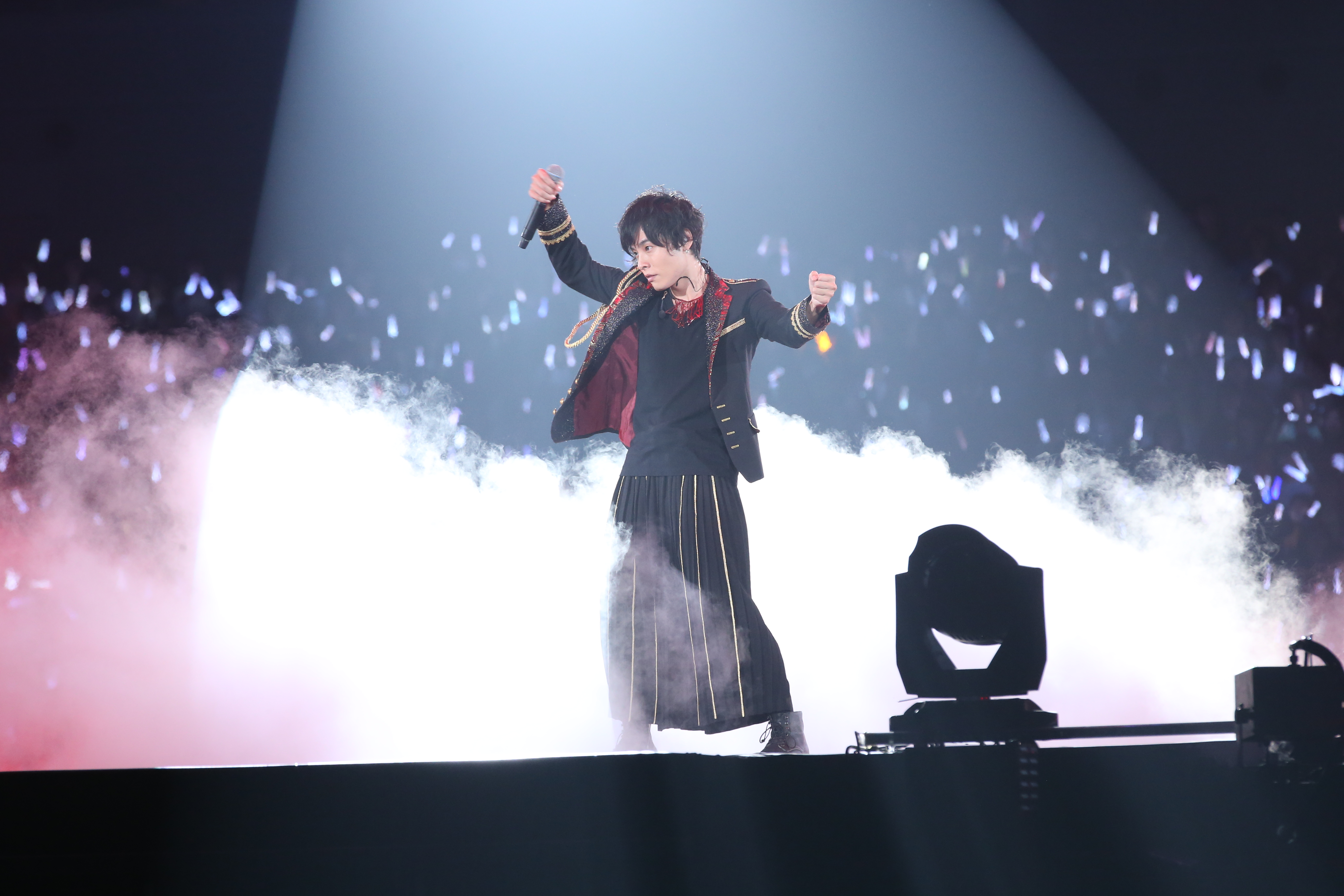 赤と黒を基調としたハードなロックテイストな衣装で、バックダンサーを従えて登場した浪川大輔さん。「Colorless sky」を伸びやかな歌声で歌い、キレッキレのダンスも。続く「FIRE」では、ステージ各所で炎が吹き上がる演出で会場の度肝を抜きました。浪川さんの熱いパフォーマンス、黄色と赤のサイリウムも相まって、まさに横浜アリーナ全体が炎に包まれたような、圧巻の風景に!