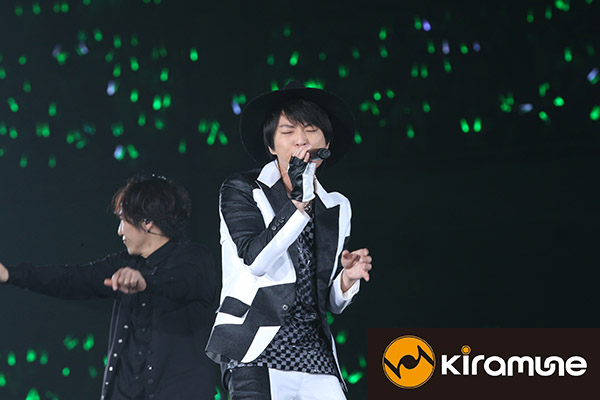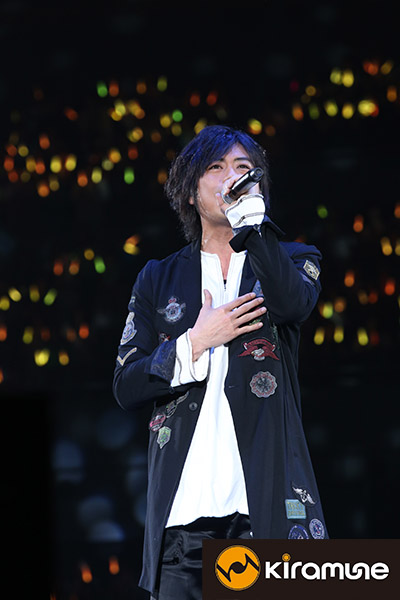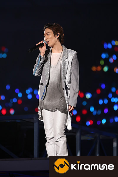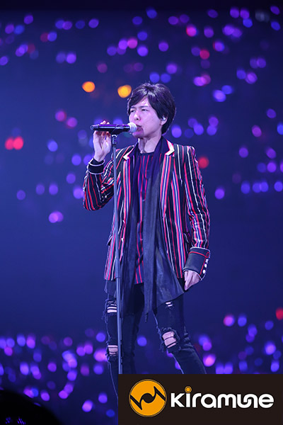 柿原徹也さんがまず披露したのは、ハイテンポでノリの良いナンバー「リングオブドランカー」。観客からの合いの手もバッチリ決まり、このキラフェスでの盛り上がりこそ「求めていた『リングオブドランカー』の形」と、感慨深そうに語っていました。そして「Othello」をムーディーに、「ドラマ」を巧みなライティングとともにセクシーに歌い上げ、柿原さんの世界へ一気に引き込まれるステージとなりました。