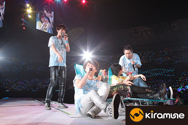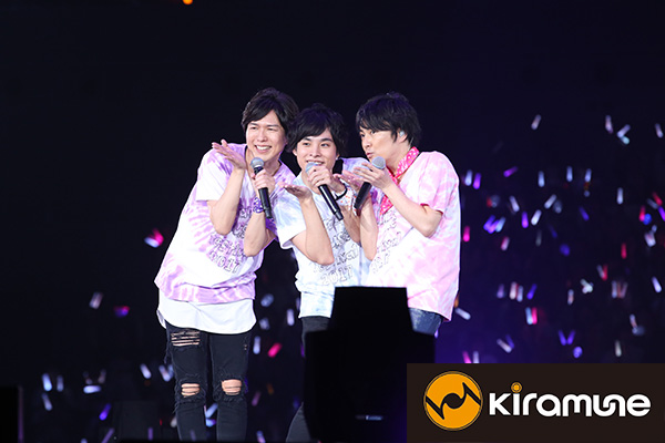柿原さんの「レッスンAtoB」では、柿原さんと同じAB型の木村さん、さらに、イベントスタッフのAB型の方々が「AB」と書かれたTシャツで大集合。曲のラストには「AB型サイコー!」と締めくくりました。Trignalの「PANORAMA SODA」では、なぜかビーチチェアでくつろいでいた浪川さんと柿原さん。そして岡本さんの「Want you」では神谷さんと吉野さんが加わり、”チュー”のポーズを決めるとアリーナは黄色い声でいっぱいに! メンバー同士はもちろん、スタッフ陣との絆も伝わってくる一幕になりました。