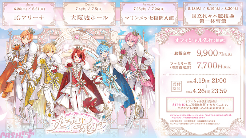 STPR所属の2.5次元歌い手アイドルグループ「すとぷり」が2026年6月4日に結成10周年を迎えることを記念し、東京・愛知・大阪・福岡の4都市を巡るアリーナツアー「すとろべりーめもりー Vol.10th anniversary ~すとぷり ARENA TOUR~」を開催します。本ツアーのチケットが、2026年4月19日(日)21:00より、オフィシャル先行受付(抽選)にてチケット申込受付を開始されました。
