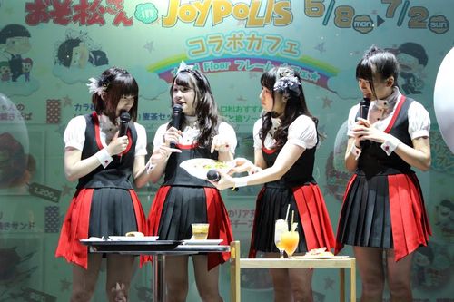 本コラボの開幕を記念して5月15日には記者発表会が実施。一般観覧も可能な記者発表会となっており、A応P(福緒 唯、巴 奎依、水希 蒼、広瀬ゆうき)による『おそ松さん』TVアニメ第1期前半OP『はなまるぴっぴはよいこだけ』のライブパフォーマンスやミニトークショー、コラボメニューの試食・試飲が行われました。