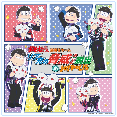 メインイベントとして、館内回遊型謎解きイベント“おそ松さん謎解きゲーム リア充の脅威からの脱出 in JOYPOLIS”が5月8日より毎週土日限定で開催。リア充の巣窟であるジョイポリスに来た6つ子もとい新品ブラザーズは、輝くリア充の気にあてられて1人また1人と力を失っていきます。