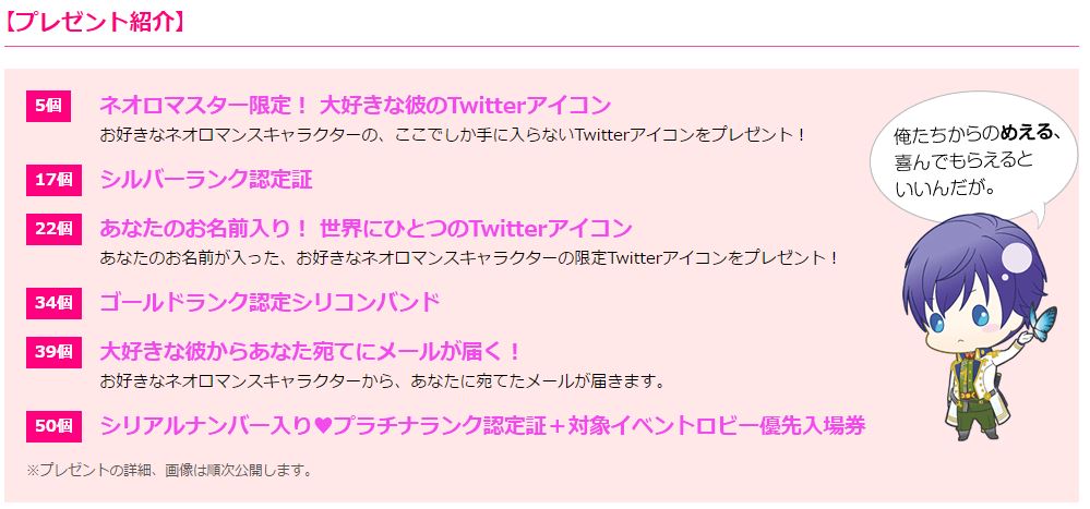 この企画では、『ネオロマンス』の対象イベントに参加してスタンプシールを貯めることで、そのシール数に応じて、オリジナルのレアアイテムをプレゼントするとともに、“ネオロマスター”のランクがアップします。限定のTwitterアイコンや、好みのキャラクターから自分の名前が入ったメールが届くなど、盛りだくさんの内容を予定しているとのこと。