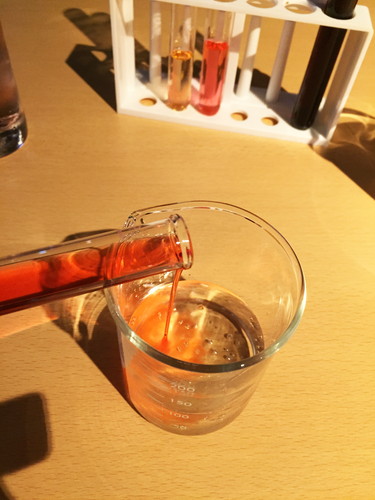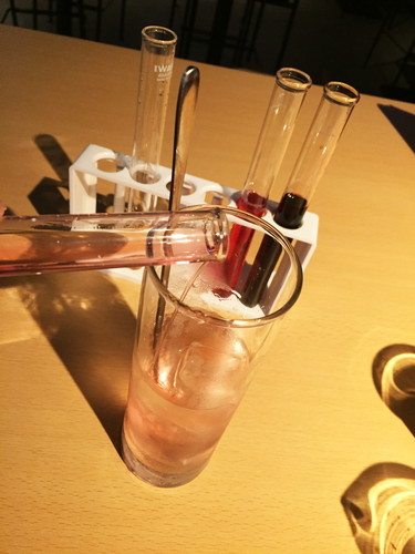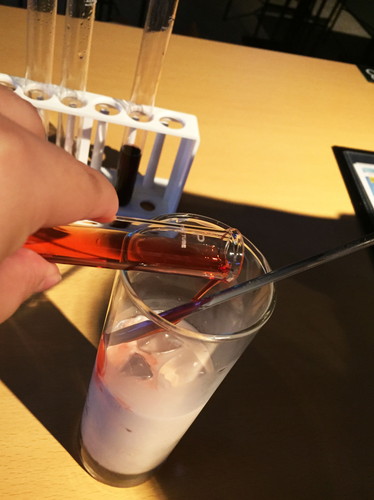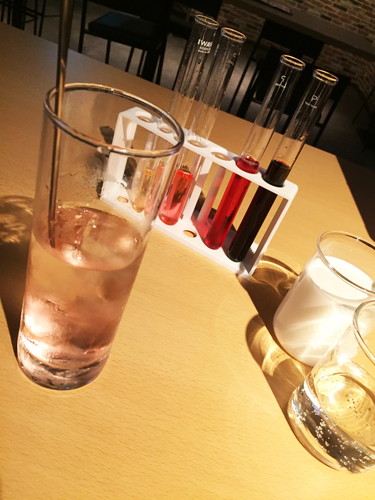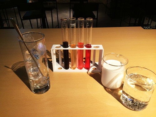 早速『孝太郎さんの実験ドリンク』で実験を開始! 試験管に入った赤系統の4つのリキュールは、ピーチ、桜、ストロベリー、カシス風味となっています。この4つのお酒をソーダ水と牛乳でお好みで割って楽しめるのがポイント☆