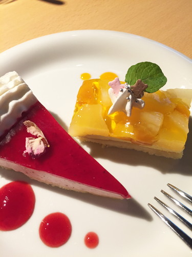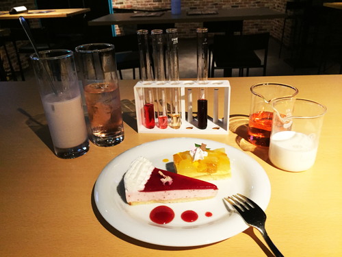 すっかり実験に夢中になってしまいましたが、『セレブなケーキ盛り合わせ』も実食。ストロベリーソースとマンゴーソースのかかったケーキのセットで、一度に2つも食べられる贅沢な、まさにセレブなメニューです。ストロベリーケーキの上に乗っている薔薇は食べることができますよ! マンゴーケーキの上に乗った熊型の飾りもかわいい♪