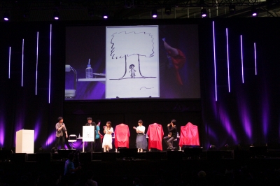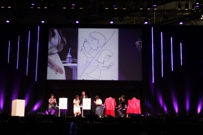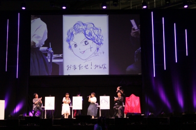 声優陣4名がイラストを描いて本作の魅力を伝えるコーナー。最初に杉山さんの絵が公開されると、その絵を使って下屋さんが桜を演じます。これには、ファンも大興奮。大きな拍手が会場を包みました。下屋さんは、見どころと言っていた“桜と士郎の料理シーン”を描いていました。