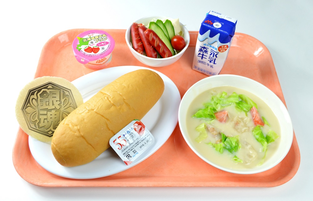 銀魂高校の学生食堂で出されているメニューをイメージ。キャベツ入クリームシチュー、ミニサラダ(ウインナー入)、牛乳、コッペパン、イチゴ牛乳プリンのセット。