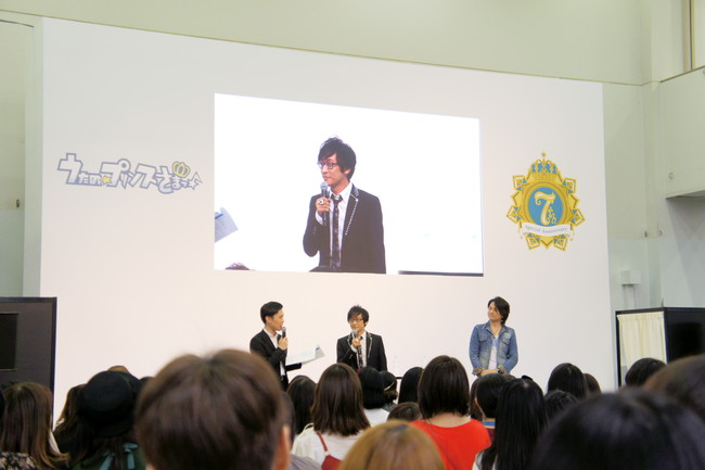 岩井さんの呼び込みを受けて寺島拓篤さん、上松範康さんがステージ上に登壇! お2人はファンの皆さんに、「『うた☆プリ』7周年おめでとうございます!」とご挨拶。ライブイベントはあれどトークイベントは久しぶりだと言う寺島さん、ファンと触れ合う機会はあまりなかったという上松さんは、揃って緊張していることを伝えながらも、『うた☆プリ』のこれまでの歩みを振り返っていくことに。