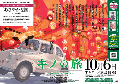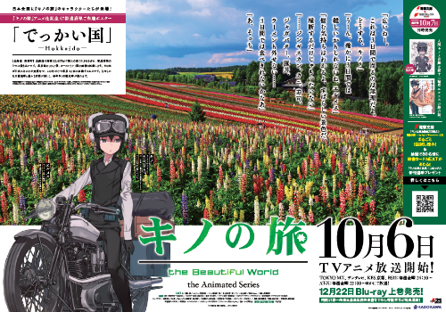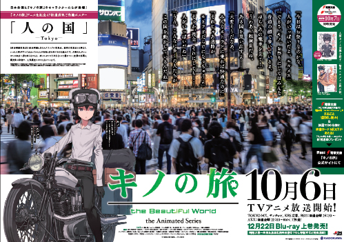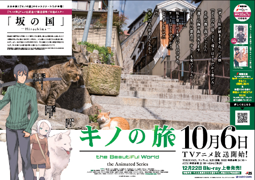 10月2日より全国各県の駅・アニメイト、紀伊國屋書店の一部店舗にて、“キノの旅 アニメ化記念47都道府県ご当地ポスター”が掲出される。全国47都道府県に『キノの旅』のキャラクターが訪問!? その土地ならではの彼らの会話は、アニメの脚本を手がける菅原雪絵さん書き下ろし&原作者・時雨沢恵一さん監修によるものだ。さらに各地を訪れるキノやエルメスのイラストは、黒星紅白描き下ろし!