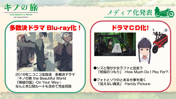 2016年にニコニコ生放送で公開された多数決ドラマ『キノの旅 the Beautiful World 「廃墟の国」-On Your Way- 』の未公開ルートも含めた全ルートの初メディア化が決定。