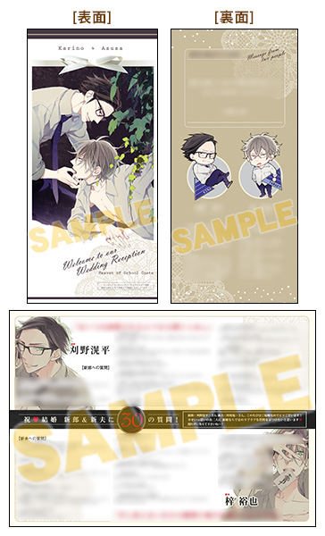 今回のフェアは、アニメイトとリブレが発行するボーイズラブレーベル‟ビーボーイ”がタッグを組み、‟ウェディング”をコンセプトに開催。ビーボーイレーベルの書籍、雑誌、ドラマCDほか対象商品を1,000円以上購入すると新郎新夫(しんろうしんぷ)のプロフィールや、新婚ならではのイチャラブな質問インタビューが楽しめる‟新郎&新夫に30の質問入り結婚式プロフィールカード(全6種)”が1枚プレゼントされる。