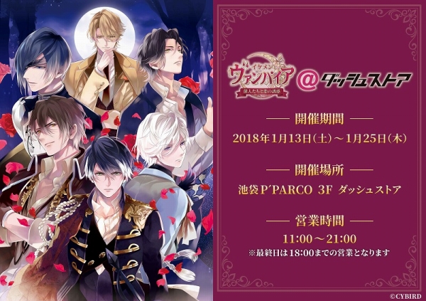 池袋P’PARCOで作品のキャラクターグッズを販売する期間限定ストア“ダッシュストア”で、女性向け恋愛ゲームブランド『イケメンシリーズ』より『イケメンヴァンパイア◆偉人たちと恋の誘惑』の出店が2018年1月13日(土)~1月25日(木)の期間に実施される。