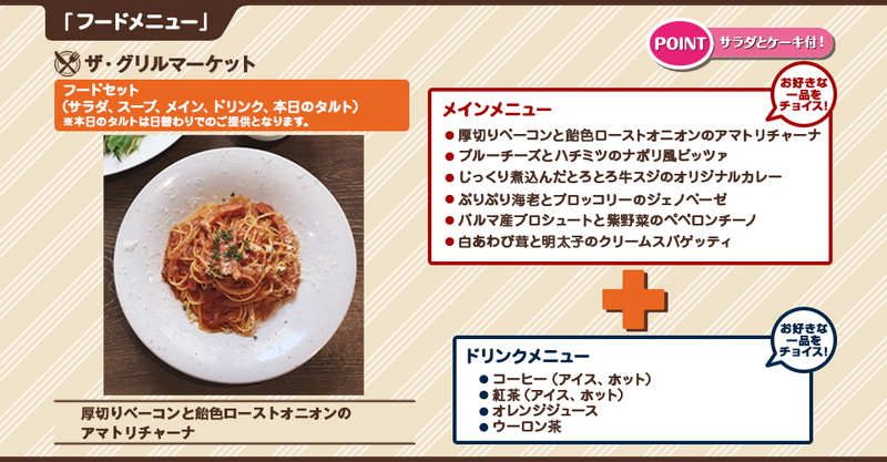 ‟一番カフェダイニング”は、“「こだわりのフード」と「オリジナルグッズ」で心地よいひとときをお客様に体験して頂く”をコンセプトとした、新しいタイプの一番カフェ。今回はレストラン‟ザ グリル マーケット”内に特別エリアが設けられており、こだわりの料理とオリジナルグッズのセットをオーダーできる。