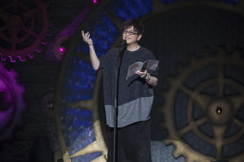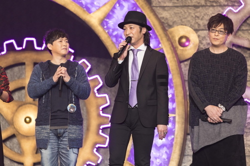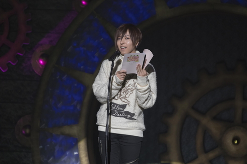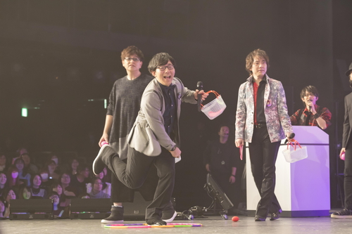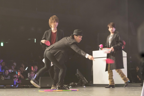 イベント開始のカウントダウンが終わると、ステージ中央の奈落から司会の豊永さん&小野さんが登場。颯爽とポーズを決めたお2人でしたが、円形のステージを広々と使って“見せる”謎ダンスを披露し会場のボルテージを急上昇させていきます。