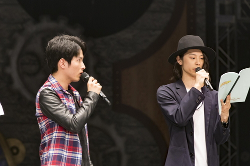 朗読コーナーの最後を締めくくったのは『DIABOLIK LOVERS』。たこ焼きの香りに誘われた逆巻アヤトと、ハマっているアプリゲームの限定キャラほしさにキノが、リジェフェスの会場を訪れます。しかも、「保護者同伴でないと参加できない」という条件をクリアするために、逆巻シュウと同伴する形で。