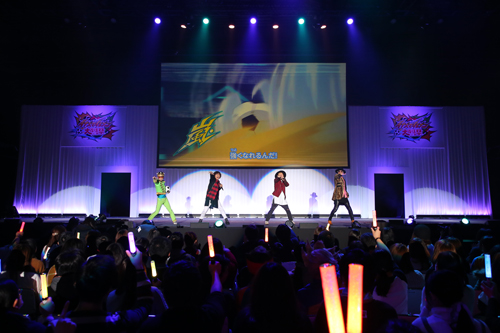 待ち望んだ復活宣言にファンが大歓声で応えると、円堂のカウントダウンボイスが。カウント0に合わせて登場したのは『イナズマイレブン アレスの天秤』の主題歌を担当するpugcat’s。