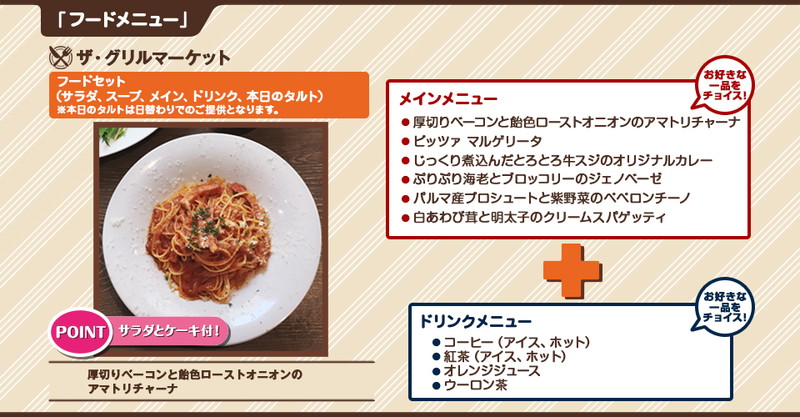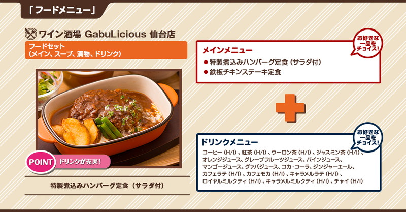 ※来店当日、対象メニューから好きなものを1品選べる。