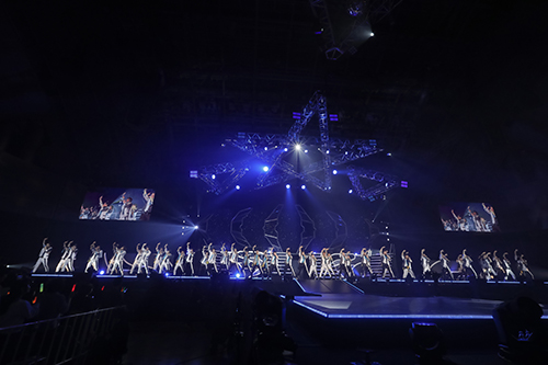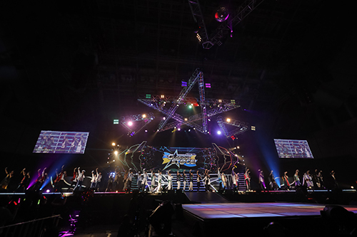 ステージ頭上に大きな1つの星が輝きだすと、その光は瞬く間にステージの周囲を走り抜け、ここが彼らの立つ場所だと言わんばかりに輝かせていきます。そして、そんなまばゆく輝くステージへ315プロダクションに所属するアイドルたちが登場し、ライブは『DRIVE A LIVE』からスタート!