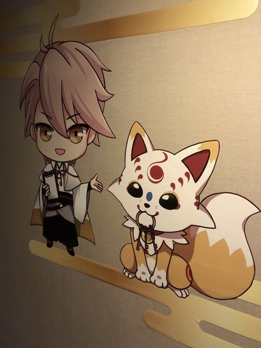 高級感あふれる東京プリンスホテルの館内。コンセプトルームのドアをくぐると、そこには“『活撃 刀剣乱舞』の審神者”とこんのすけの姿が。遠路はるばるやってきた皆さんを、刀剣男士たちとともにお出迎えしてくれます。