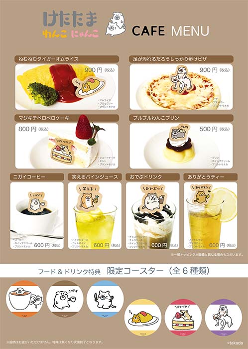 また、フード・ドリンクを1品注文するごとに、コースター(全6種)が1枚ランダムでもらえる。ぜひとも『けたたまわんこ&にゃんこ』を堪能しにいこう!