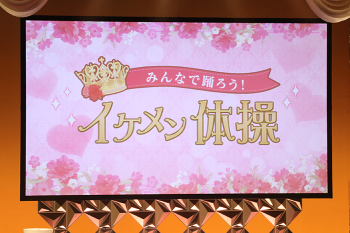 続いて、5周年感謝祭のために特別に用意されたオリジナルシナリオ“イケメンだらけの晩餐会”を出演キャストたちが生朗読で披露。次は、イケメン研究所が考案した“イケメン体操”を踊るコーナーがスタートし、壁ドン、顎クイ、肩ズンなど、イケメンと言われる仕草が入った体操をスクリーンに映し出されたPVとともに、ゲストとファンとで和気あいあいと踊る賑やかなコーナーとなった。