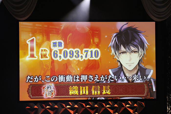 続いて、15位から6位までが一斉に発表され、その後5位から1位は、カウントダウン形式で1人1人の名前が読み上げられ、遂にドキドキの瞬間が! 6,093,710票を獲得し、 2位の『イケメン戦国◆時をかける恋』の徳川家康と約85万票差をつけて、『イケメン戦国◆時をかける恋』の織田信長(CV.杉田智和)が、見事1位に返り咲き、客席ではハンカチで涙を拭う姿も見られた。