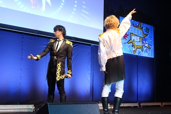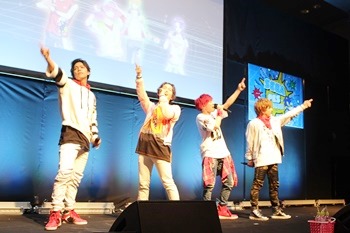 ステージ上にMCの松風雅也さん、阿座上洋平らが登場すると、呼び込みを受けて『Readyyy!』に登場する18名のキャストが登場! 18名ものキャストが勢ぞろいする姿は圧巻だ。自己紹介では「黄色いいですか?」、「紫色でお願いします!」とファンに向けて希望のサイリウムのカラーで照らしてもらうことをお願い。会場が各ユニットのイメージカラーに染められると嬉しそうな笑みを浮かべていたのが印象的だった。