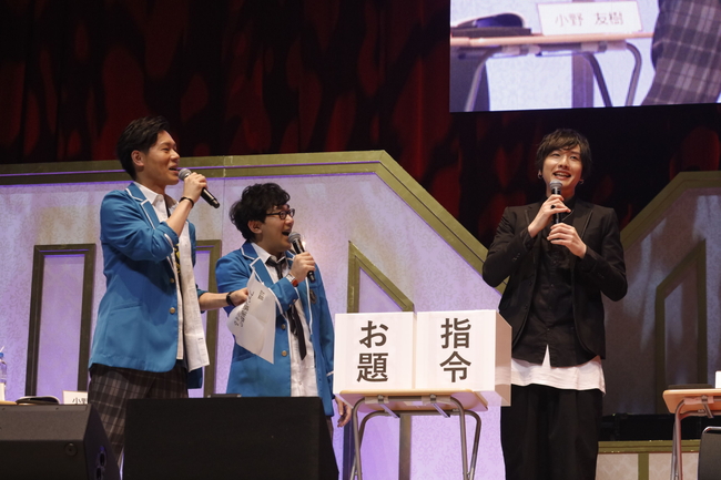 続く“出張! ニコ生再現コーナー ファン感謝祭Ver.”では、“月刊 あんさんぶるスタジオ!”名物コーナーを再現。MCを担当する、小野さん&神尾さんがイベントでもMCを担当する。ボックスから引いた“テーマ”と“指令”に沿ったメッセージを届け、観客からの反応が一番鈍かった人は苦~い罰ゲームを受けなければならないというルール。このゲームには高橋さん、細貝さん、新田さん、高坂さんが挑戦!