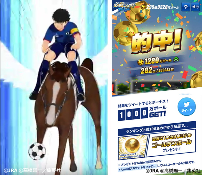 さらに、“キャプテン翼ダービーイベント@渋谷MODI”で配布する“リーフレット”、もしくは、特設WEBサイト内の‟必殺シュートダービー”のプレイ画面を、5月27日に東京競馬場で購入した日本ダービーの勝馬投票券500円分以上(※合算可)と共に提示すると、“キャプテン翼ダービー”オリジナルグッズが当たる抽選会も東京競馬場で開催される。