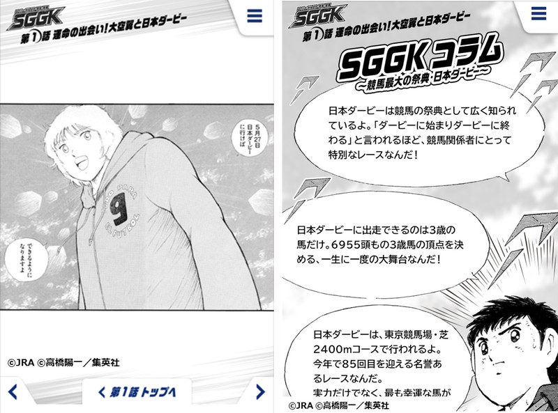 第85回日本ダービー(GⅠ)の開催に先立ち、日本中央競馬会と『キャプテン翼』とがコラボした特設WEBサイト“キャプテン翼ダービー”が公開された。