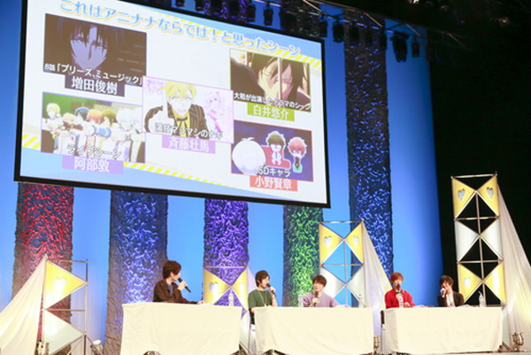 一方で、夜公演は別のテーマで、「自分たちが演じているアイドルの名場面」を振り返り、壮五が環に怒りを爆発させるシーンの秘話や、一織のミュージックフェスタでの失敗シーンの重要性、陸のピュアな言葉の数々、天のプロ意識の高さ、ライブ前の円陣の時に言う大和の台詞など各アイドルの名場面を語った。そして、自分たちの役の話ではないが最終話で追加されたファンの台詞が感動的だったと小野さんが話すと、全員が「あのシーン本当に良かったよね!」と口々に賛同し、キャスト陣のアニナナへの思い入れが感じられる一幕となった。