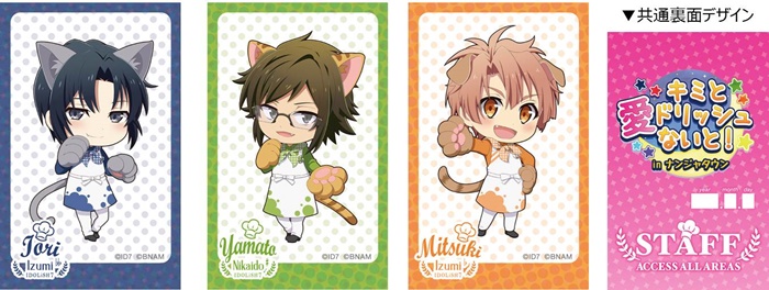 ねこ耳クッキングスタイルのアイドルとマネージャーたちや、グループのモチーフがデザインされたオリジナルグッズが販売。『アイドリッシュセブン』関連商品を3,000円購入ごとに、オリジナルダイカットポストカード(全16種)1枚が手に入る。