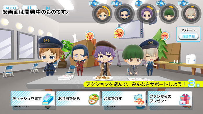 ドラマに出演するアイドルたちの組み合わせや配役は、プロデューサーであるユーザーが自由に決めることができる。アイドルたちは風邪をひいていたり、のどが痛かったりと、コンディションが良くない場合があるので、控室パートで差し入れなどをしてコンディションを整えよう。コンディションは、このあとのドラマの出来を左右する。