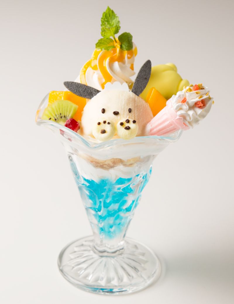 冷たいバニラアイスになった“ポチャッコ”がボリューミーなパフェのトップにちょこんと乗って、キュートな存在感を発揮。ホイップクリームとスポンジケーキの甘さ×マンゴー・キウイ・ベリーの酸味が程よくマッチし、ブルーハワイゼリーが清涼感を演出した夏らしいメニュー。クリームにダイブした“ぐでたま”のプリケツマシュマロもお見逃し無く!