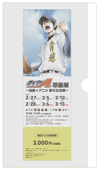 『ダイヤのA』の原画展が大阪南港のATC特設会場にて開催される。開催期間は、2016年2月27日(土)~28日(日)、3月5日(土)~6日(日)、12日(土)~13日(日)の計6日間。このイベントは、以前『京都国際マンガ・アニメフェア2015』で開催された『ダイヤのA原画展』の展示に、アニメ資料の展示が加わったものとなる。