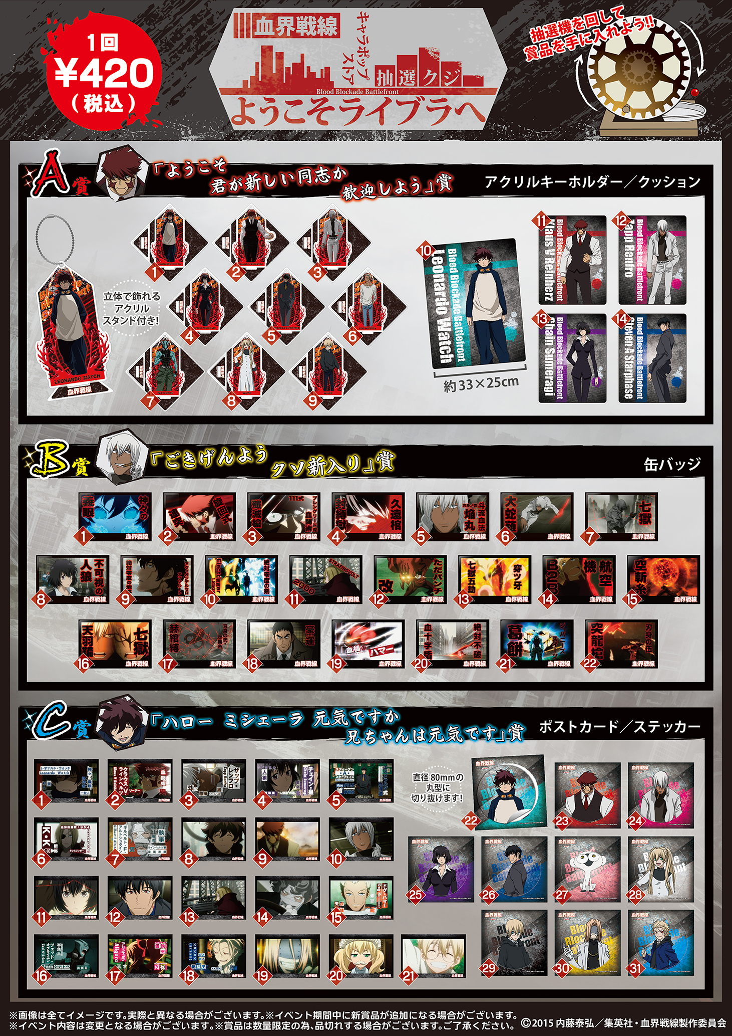 『血界戦線』第1話のエピソードをモチーフにしたミニアトラクション。アトラクションの上部にボールを投げ、最下段のボックスに設定された各賞に応じた賞品が必ず当たる。賞品はキャラポップストアオリジナルグッズ。