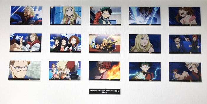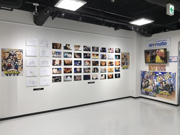 アニメイトJMA東京タワーの入り口には緑谷出久、爆豪勝己、麗日お茶子といった雄英高校ヒーロー科のクラスメイトたちのスタンディパネルがお出迎え。さらに奥に入ると、オープニングの原画やテレビアニメ第3期の場面カットが展示中。その他グッズ販売スペースにもアニメエンディングや公開中の劇場映画予告カットパネルがずらり。グッズ展開だけでなく、作品ファンであれば思わず立ち止まってしまう展示物は必見だ。
