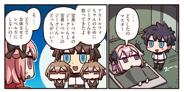 『ますますマンガで分かる!FGO』アストルフォの寝室に来た主人公。なぜかジークくんを2人抱えているが…?