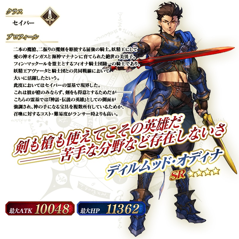 本イベントの開催にあわせ新登場した“★4(SR)ディルムッド・オディナ(セイバー)”は、『Fate/Grand Order』に“★3(R)ディルムッド・オディナ(ランサー)”として登場していた“ディルムッド・オディナ”が、セイバーのクラスで召喚されたサーヴァント。