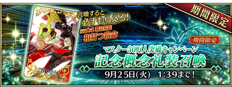『FGO Arcade』のマスター30万人突破を記念した概念礼装召喚が実施。キャンペーン召喚を行うと、新規描き下ろしの概念礼装“★4(SR)相打つ宿命”を必ず召喚することができる。