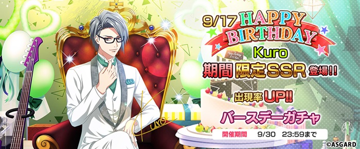9月17日はバンド”apple-polisher(アップルポリッシャー)”のリーダーでもある”Kuro(黒沢 忍)”の誕生日を記念して、Kuroのバースデー限定SSRをピックアップした期間限定スペシャルガチャを開催される。
