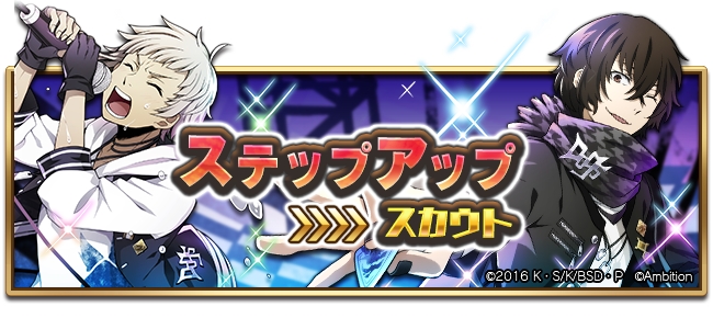 探偵社、ポートマフィアごとにステップアップスカウトが開催。STEP3、5でSSRが1体確定、STEP6以降はSSR1.5倍で何度でも引ける。
