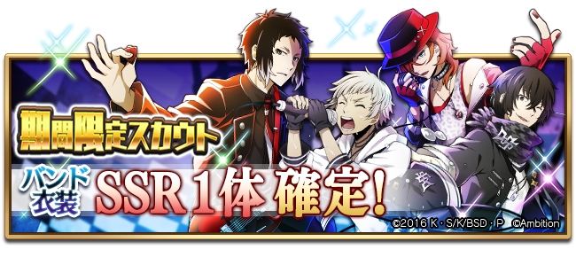 イベントと同期間開催されるバンドスカウト(ポートマフィア)からは、特効キャラクターSSR[バンド]芥川龍之介、SSR[バンド]中原中也、SR[バンド]立原道造、SR[バンド]銀が入手できる。
