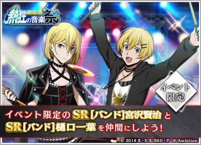 本イベントでは、キャラクターたちがバンド衣装を身にまとって登場! 期間限定で開放されるステージをクリアしてイベントアイテムやptを集めることで、限定SRの宮沢賢治と樋口一葉が手に入る。ステージには今回から新たに“高難易度”も実装されるので、今まで以上に効率よくポイントを稼いでいこう。