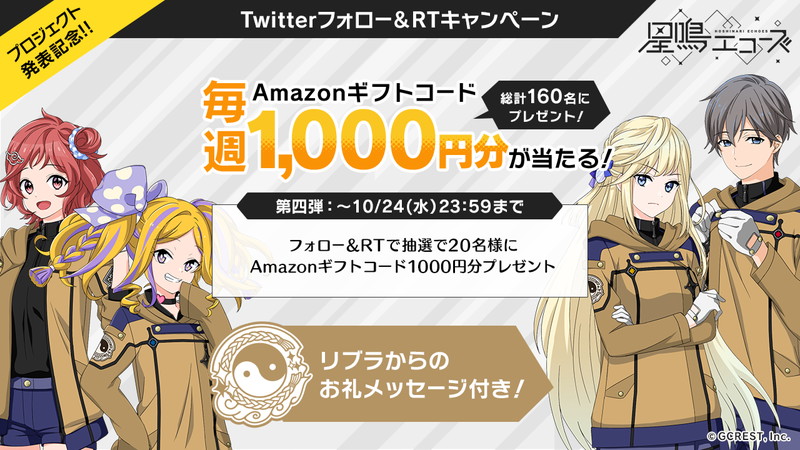 『星鳴エコーズ』公式Twitter(@hoshinari_PR)をフォローし、該当投稿をリツイートした方の中から抽選で 20名にAmazonギフトコード1000円分がリブラメンバーからのお礼メッセージ付きでもらえる。本キャンペーンは毎週実施が予定されており、キャンペーン全体で合計160名に賞品がプレゼントされる。