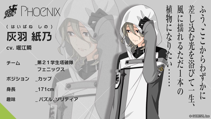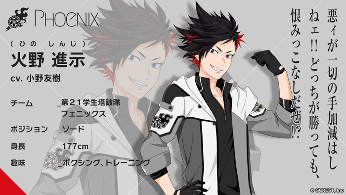 “フェニックス”のキャラクターボイスには、小野友樹さん(火野進示役)、小林大紀さん(薄氷世人役)、置鮎龍太郎さん(天覧堂ジャッファール役)、堀江 瞬さん(灰羽紙乃役)の4名が決定し、キャラクターごとのチーム内ポジション・身長・趣味なども明らかに。また、本チームのキャラクターイラストおよびチームエンブレムは、人気漫画家兼イラストレーターの鈴木次郎氏が原案を担当する。