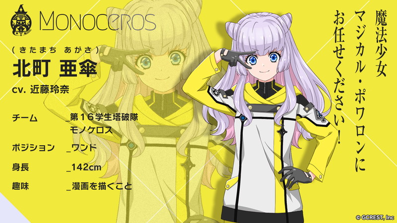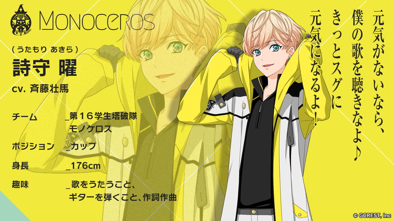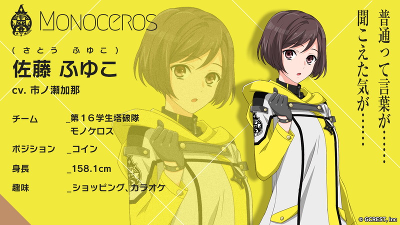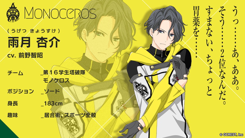 “モノケロス”のキャラクターボイスには、前野智昭さん(雨月杏介役)、市ノ瀬加那さん(佐藤ふゆこ役)、近藤玲奈さん(北町亜傘役)、斉藤壮馬さん(詩守曜役)の4名が決定し、キャラクターごとのチーム内ポジション・身長・趣味なども明らかに。また、本チームのキャラクターイラストおよびチームエンブレムは、人気漫 画家兼イラストレーターの雪広うたこさんが原案を担当する。