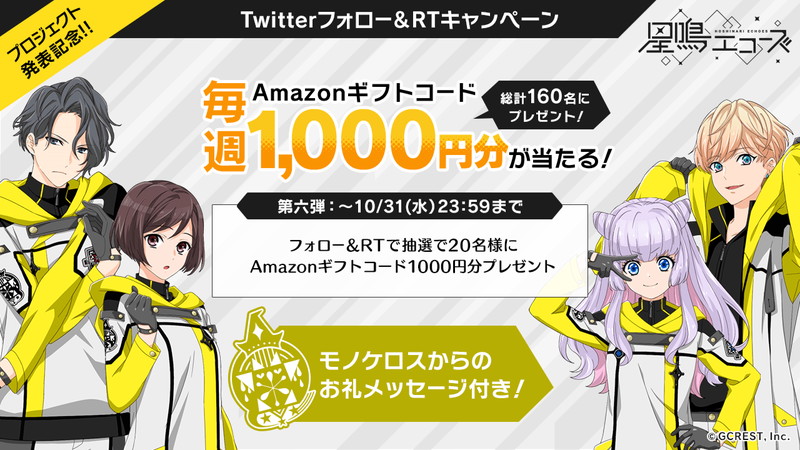本作発表記念として、10月25日よりTwitterキャンペーン第6弾が開催。『星鳴エコーズ』公式Twitter(@hoshinari_PR)をフォローし、該当投稿をリツイートした中から抽選で20名にAmazonギフトコード1000円分がモノケロスメンバーからのお礼メッセージ付きで当たる。本キャンペーンは毎週実施が予定されており、キャンペーン全体で合計160名に賞品が当たる。